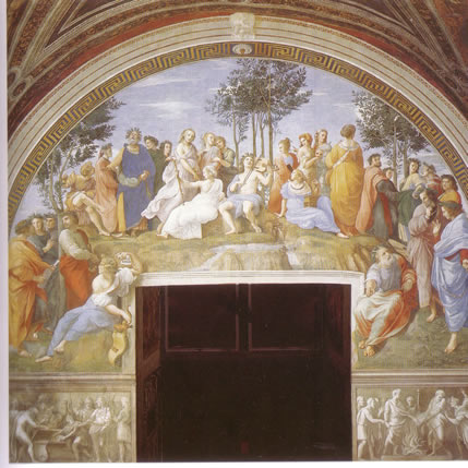 Ille hic est Raphael, timuit quo sospite vinci Rerum magna parens, et moriendo mori. TEBALDEO, PURE RAFFIGURATO NELL'AFFRESCO, ESPRIME QUELLO CHE I CONTEMPORANEIPENSAVANO DI RAFFAELLO E CIOE' CHE LUI VIVO LA NATURA TEME' DI SOCCOMBERE,E LUI MORTO DI MORIRE. CON POCHI ELEMENTI L'URBINATE E' CAPACE DI TRATTEGGIARE LA PERSONALITA'DEI GRANDI POETI(scorri l'immagine con il mouse e clicca quando appare la mano) |